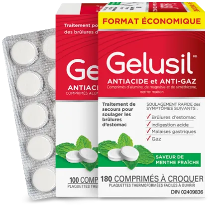 Les comprimés à mâcher GelusilMD sont disponibles en boîte de 100 & 180 comprimés.